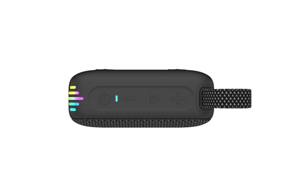 Bluetooth hangszóró, 5 W, 45 mm hangszóró + passzív membrán, Bluetooth® (V6.0), MicroSD kártyahely (max. 32GB), TWS funkció két eszköz vezetéknélküli összekapcsolásához, IPX 7 védelem, LED fényeffektek, akku Lithium-ion 3.7V 900mAh, akár 8,5óra üzemidő, méretek 98 x 76 x 40 mm, tömeg 0,225 kg, fekete