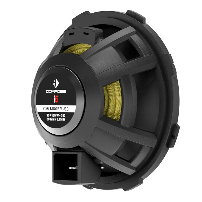 HELIX COMPOSE i5 középhangszóró, 80mm szilícium bevonatú papír membrán, üvegszálas hi-tec polimer kosár, push-pull neodymium mágnes, 90/135W, 200Hz-6kHz, 3Ohm, érzékenység 92dB, 20mm tekercsátm., beépítési átmérő 70mm, mélység 30,2mm