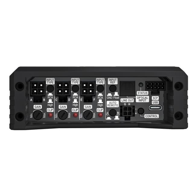 ClassD 6 csatornás erősítő 8 csatornás DSP-vel, 6x100W @4Ohm, 6x190W @2Ohm, 3X380W @4Ohm, bemenetek: 6 RCA/6 hangszóró/optikai/2 remote, kimenetek: 6 hangszóró/2RCA/1remote, 20Hz-22kHz, 64 bites DSP, 102dB jel/zaj, THD <0.005%, 3x25A bizt., csillapítás 70, ADEP.3 intelligens nagyjelszint bemenet, Start-stop 6 voltig, aranyozott csatlakozók, 40x263x114 mm
